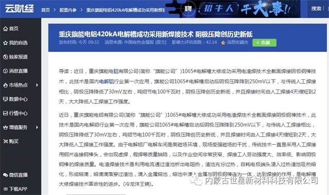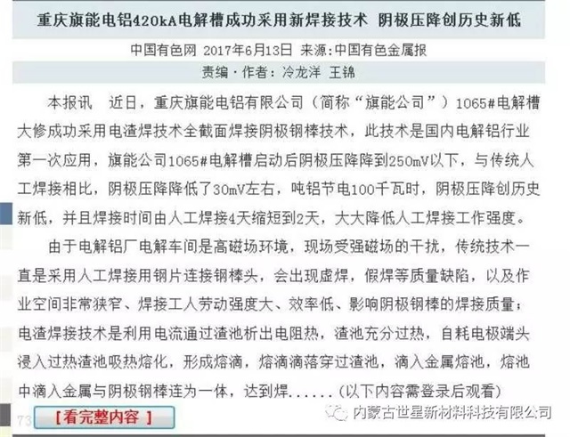 近日中国有色金属网和中国有色金属报上头条报道《重庆旗能电铝420KA电解槽成功采用新焊接技术  阴极压降创历史新低》,主要内容为:重庆旗能电铝有限公司1065#电解槽大修成功采用电渣焊技术全截面焊接阴极钢棒技术,此技术是国内电解铝行业第一次应用,旗能公司1065#电解槽启动后阴极压降降到250mV以下,与传统人工焊接相比,阴极压降降低了30mV左右,吨铝节电100千瓦时,阴极压降创历史新低,并且焊接时间由人工焊接4天缩短到2天,大大降低人工焊接工作强度,是电解槽大修焊接技术革命性的进步。